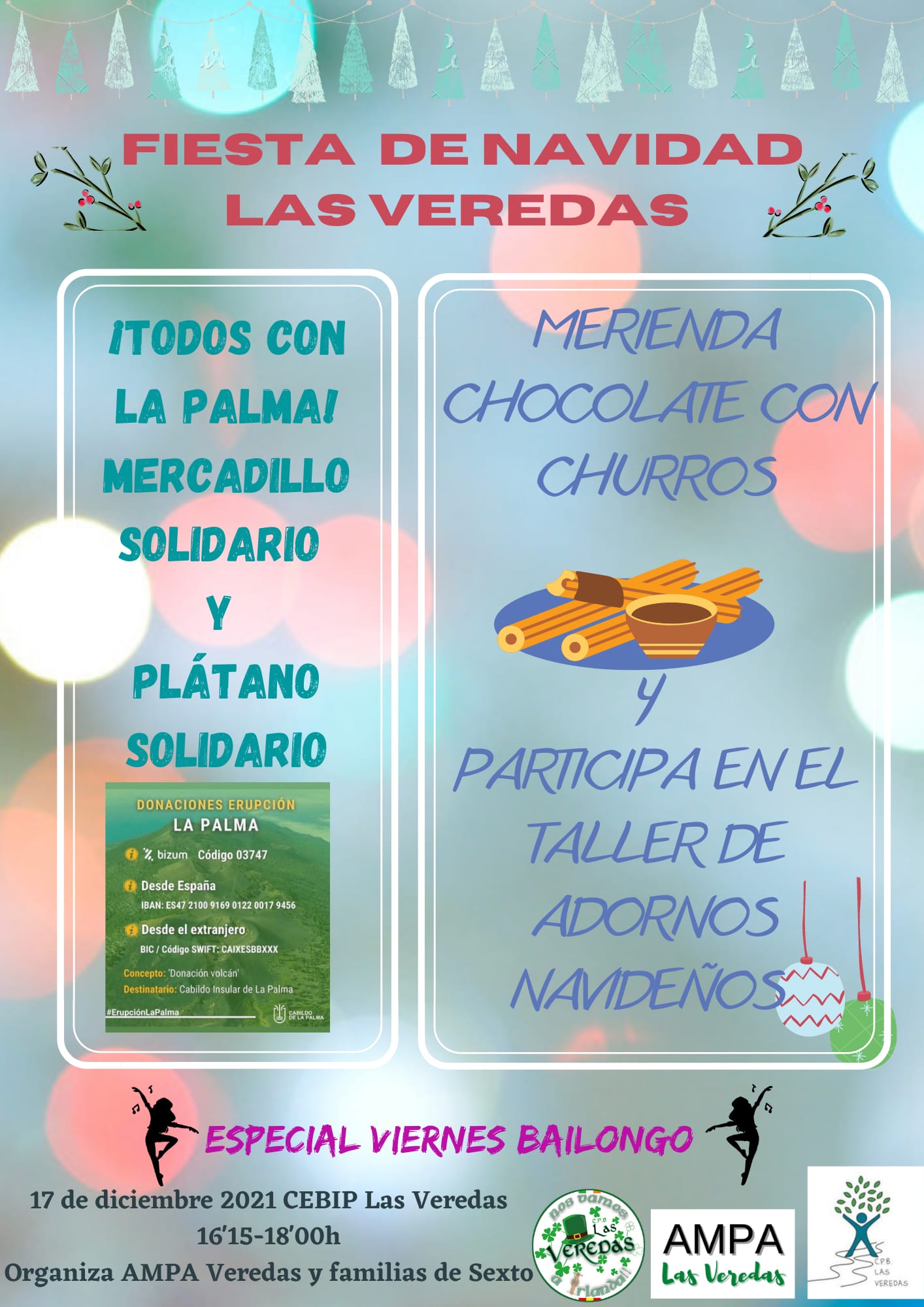 Mañana os esperamos en el cole para compartir un ratito junt@s, merendar y celebrar la navidad y la llegada del año nuevo. Será una fiesta solidaria, donde podremos colaborar para enviar dinero a La Palma y para el viaje a Irlanda de l@s alumn@s de sexto.