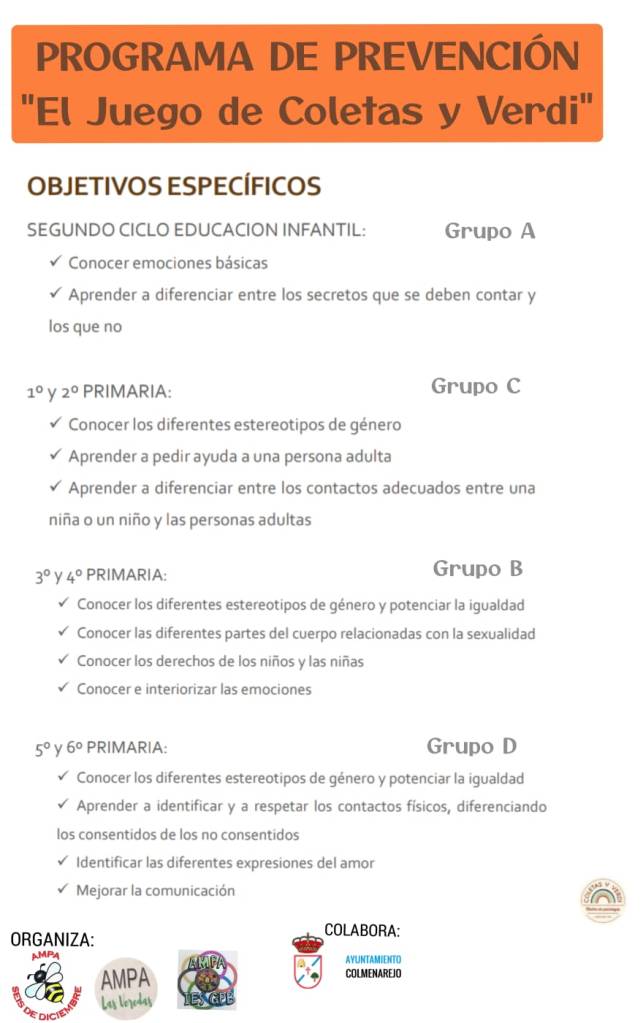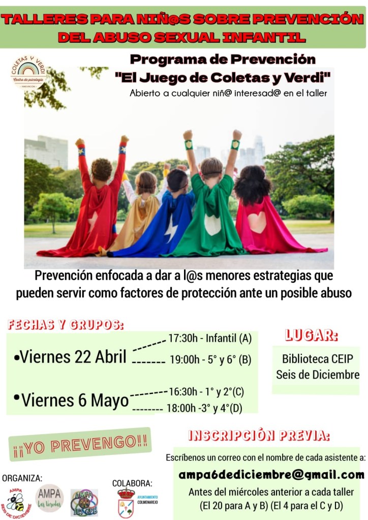 Después de la charla dirigida a familias sobre la PREVENCIÓN DEL ABUSO SEXUAL EN LA INFANCIA se propusieron talleres para acercar a los niños y niñas entre 6 y 12 años a contenidos de educación emocional y afectiva-sexual que son básicos para la prevención de dificultades, abusos y trastornos que pueden darse en el desarrollo vital.