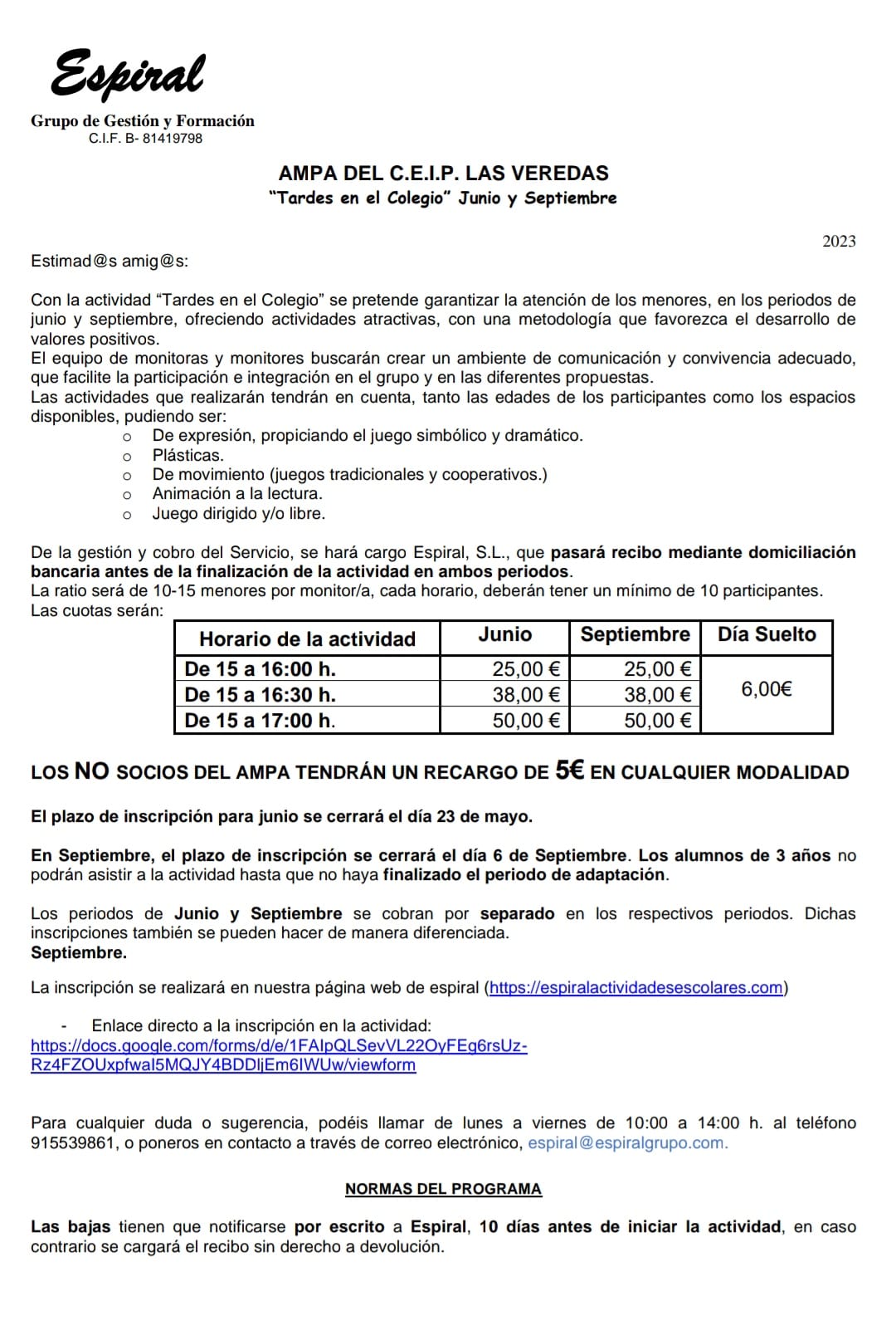 Os recordamos que el próximo martes día 23 de mayo finaliza el plazo para la inscripción de vuestras hijas e hijos en las tardes de junio y septiembre.